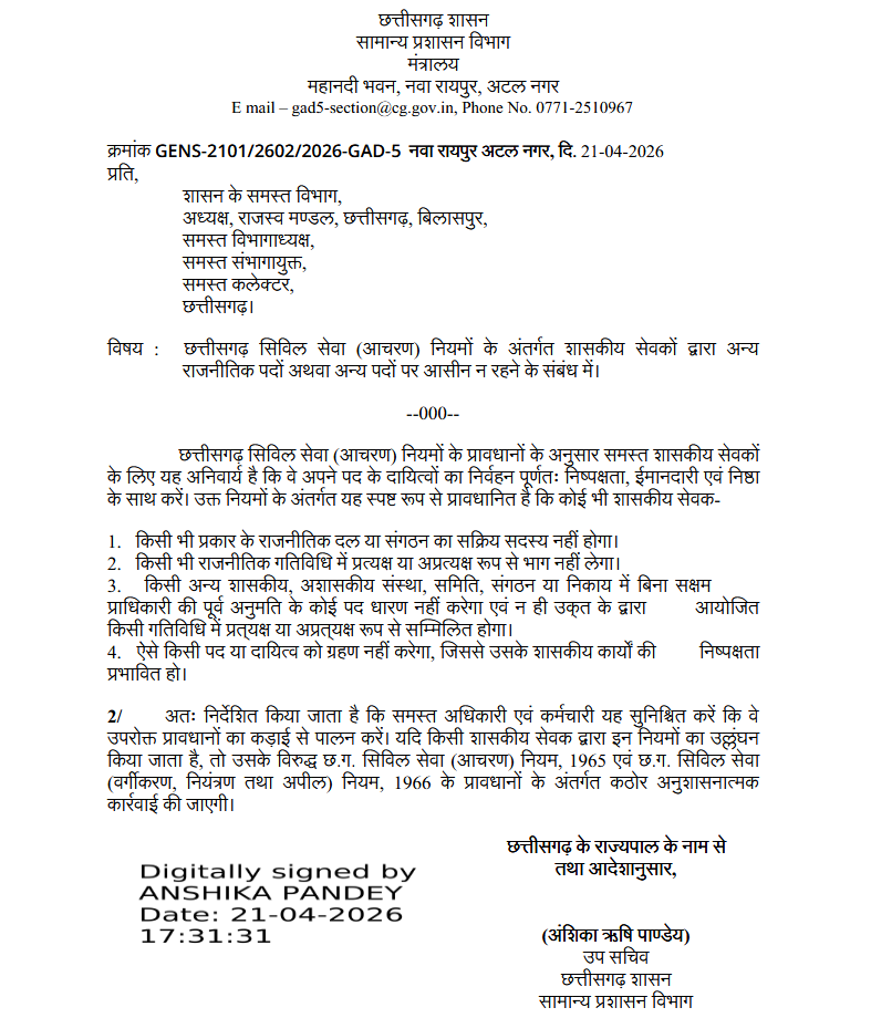 रायपुर। प्रदेश सरकार ने शासकीय सेवकों के लिए ‘छत्तीसगढ़ सिविल सेवा (आचरण) नियम’ के तहत एक महत्वपूर्ण और सख्त आदेश जारी किया है। राज्य सरकार ने स्पष्ट किया है कि कोई भी सरकारी कर्मचारी या अधिकारी किसी भी राजनीतिक गतिविधि में शामिल नहीं हो सकेगा और न ही किसी राजनीतिक पद पर आसीन रह सकेगा। आदेश में सभी विभागों, संभाग आयुक्तों और जिला कलेक्टरों को कड़ाई से नियमों का पालन सुनिश्चित करने के निर्देश दिए गए हैं।