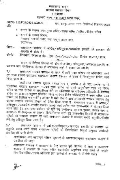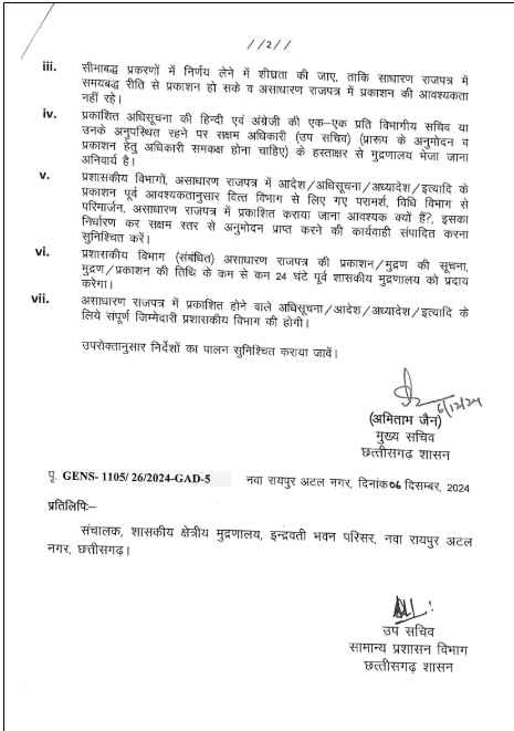 iv. प्रकाशित अधिसूचना की हिन्दी एवं अंग्रेजी की एक-एक प्रति विभागीय सचिव या उनके अनुपस्थित रहने पर सक्षम अधिकारी (उप सचिव) (प्रारूप के अनुमोदन व प्रकाशन हेतु अधिकारी समकक्ष होना चाहिए) के हस्ताक्षर से मुद्रणालय भेजा जाना अनिवार्य है.Chhattisgarh government strict on extraordinary gazette publication, Chief Secretary issued strict guidelines