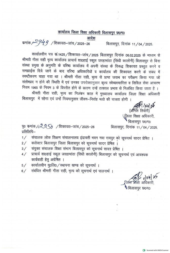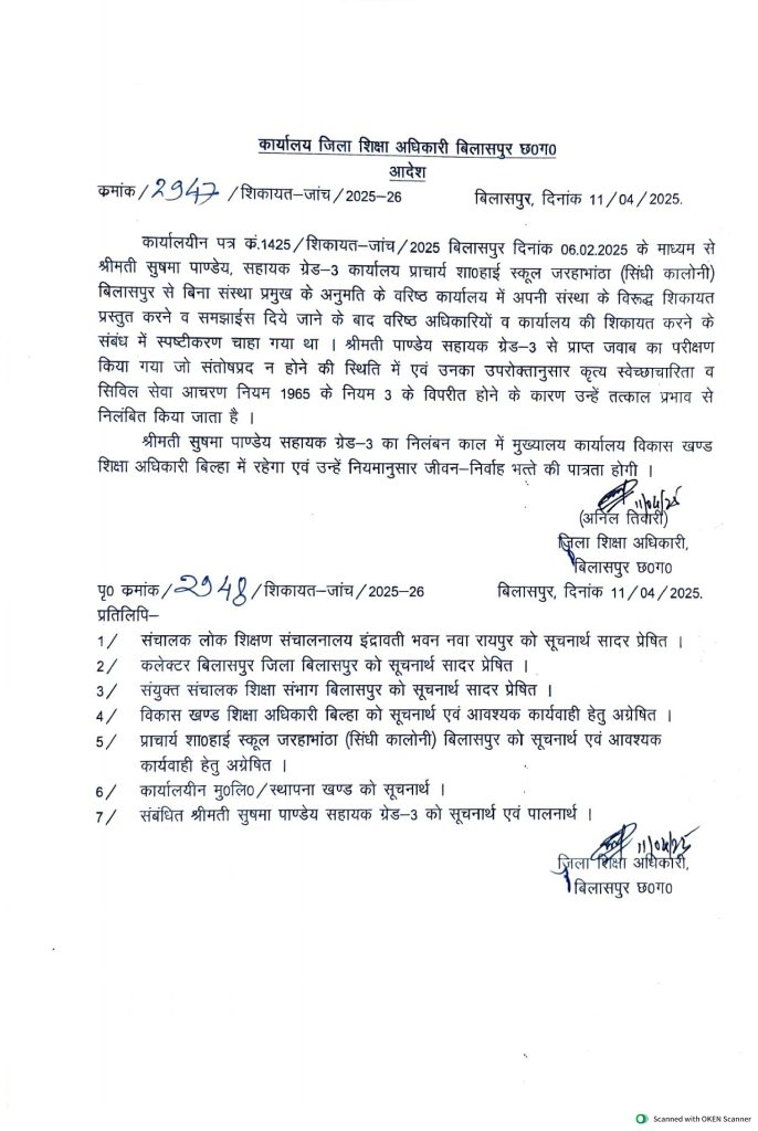 वीरेंद्र गहवई, बिलासपुर. छत्तीसगढ़ के न्यायधानी बिलासपुर में सरकारी स्कूल की महिला क्लर्क और दो भृत्य के खिलाफ निलंबन की कार्रवाई की गई है. इन्हें समय पर ड्यूटी आना पसंद नहीं था और कोई रोक-टोक करें वो तो बिलकुल अस्वीकार था. चाहे स्कूल का प्राचार्य हो या स्टाफ बिना संस्था प्रमुख्य की अनुमति के वरिष्ठ कार्यालय में सबकी कम्प्लेन लेकर पहुंच जाते. अब यही तीनों शासकीय कर्मचारियों पर भारी पड़ा. जारी किए गए नोटिस में जवाब असंतोष पाए जाने पर जिला शिक्षा अधिकारी ने मामले पर एक्शन लिया है.