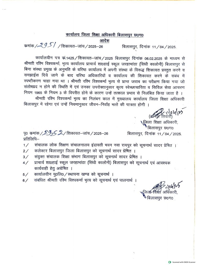 दरअसल, पूरा मामला शासकीय हाई स्कूल जरहाभाठा का है. जहां दो साल से महिला क्लर्क सुषमा पाण्डेय और भृत्य रश्मि विश्वकर्मा और गीता राही समय पर स्कूल नहीं आ रहे थे. तीनों को समय पर ड्यूटी आने के लिए स्कूल प्रचार्य और स्टाफ ने बार-बार समझाइश दी. लेकिन उनका रवैया नहीं बदला और सुधार की बजाए तीनों ने संस्था प्रमुख्य की अनुमति के बिना वरिष्ठ कार्यालय में शिकायत लेकर पहुंच जाते थे.
