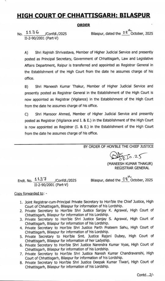 वीरेंद्र गहवई, बिलासपुर। छत्तीसगढ़ उच्च न्यायालय में उच्च न्यायिक सेवा से जुड़े अधिकारियों का तबादला और नियुक्तियां की गई हैं। इस संबंध में विधिवत आदेश भी जारी कर दिया गया है। आदेशानुसार उच्च न्यायिक सेवा के सदस्य और वर्तमान में विधि एवं विधायी कार्य विभाग के प्रधान सचिव रजनीश श्रीवास्तव को कार्यभार ग्रहण करने की तिथि से उच्च न्यायालय की स्थापना में महापंजीयक के पद पर स्थानांतरित किया गया है।