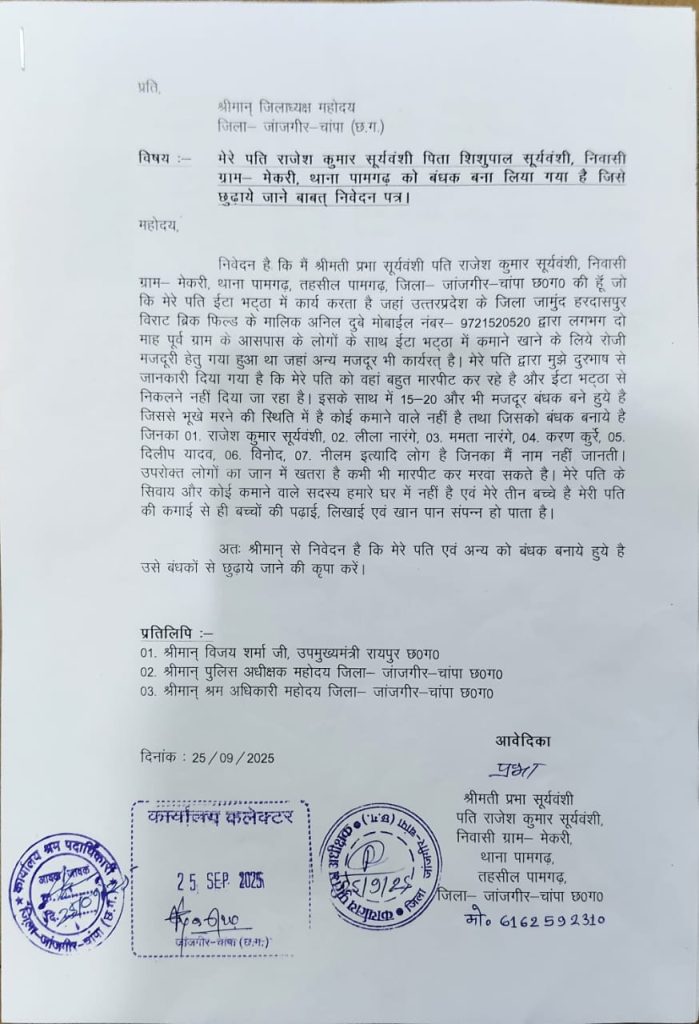 इस मामले की प्रतिलिपि उपमुख्यमंत्री विजय शर्मा, पुलिस अधीक्षक जांजगीर-चांपा और श्रम अधिकारी को भी भेजी गई है. आवेदन 25 सितंबर 2025 को कलेक्टर कार्यालय में प्रस्तुत किया गया, जिस पर कलेक्टर कार्यालय की मुहर और प्राप्ति दर्ज की गई है.
