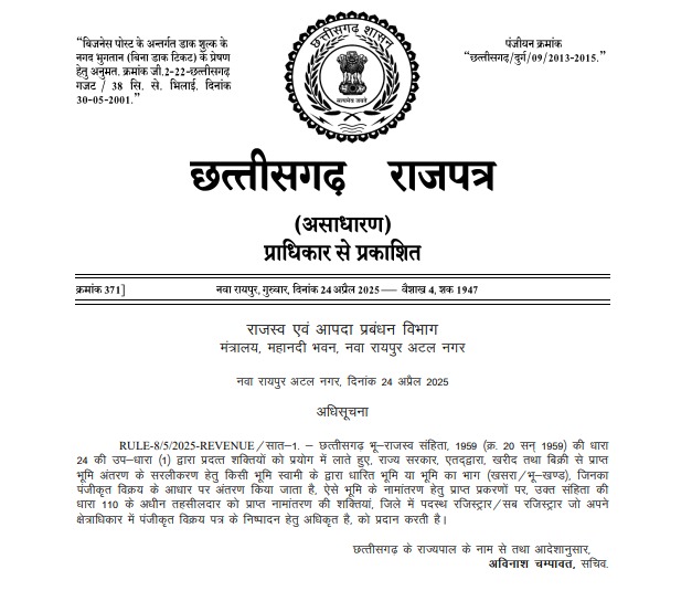 बता दें कि इस बदलाव के साथ अब पंजीकृत रजिस्ट्री होते ही संबंधित भूमि और संपत्तियों का नामांतरण स्वचालित रूप से हो जाएगा। यह संशोधन छत्तीसगढ़ भू-राजस्व संहिता, 1959 की धारा 24 की उप-धारा (1) और धारा 110 के तहत किया गया है।