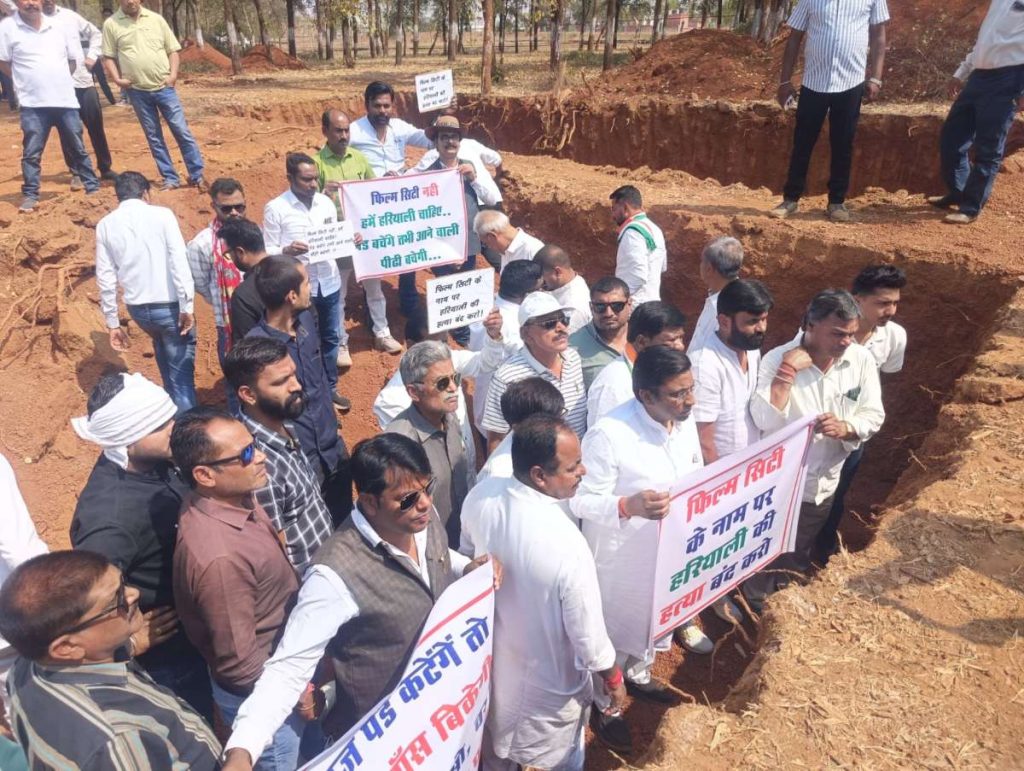 नितिन नामदेव, रायपुर। राजधानी रायपुर के नवा रायपुर स्थित तूता क्षेत्र में प्रस्तावित चित्रोत्पला फिल्म सिटी के निर्माण को लेकर विरोध तेज हो गया है। फिल्म सिटी के लिए करीब 1500 पेड़ों की कटाई के निर्णय के खिलाफ कांग्रेस ने बुधवार को अनोखा प्रदर्शन किया। पर्यावरण संरक्षण की मांग को लेकर कांग्रेस नेता और कार्यकर्ता निर्माण स्थल पर खोदे गए गड्ढों में उतर गए और सरकार के फैसले के खिलाफ जमकर नारेबाजी की।