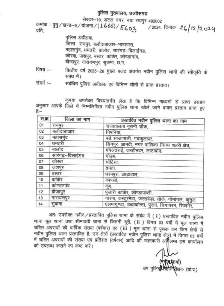 जारी आदेश के अनुसार, नए थाने खोले जाने वाले जिलों की सूची में रायपुर, बलौदाबाजार, महासमुंद, धमतरी, बालौद, सारंगढ़-बिलाईगढ़, कोरबा, जशपुर, बस्तर, कांकेर, कोंडागांव, बीजापुर, नारायणपुर और सुकमा जिले शामिल हैं. इसके अलावा, राजधानी रायपुर के राजातालाब नूरानी चौक स्थित नूरानी चौकी को अब थाना में परिवर्तित कर दिया जाएगा.