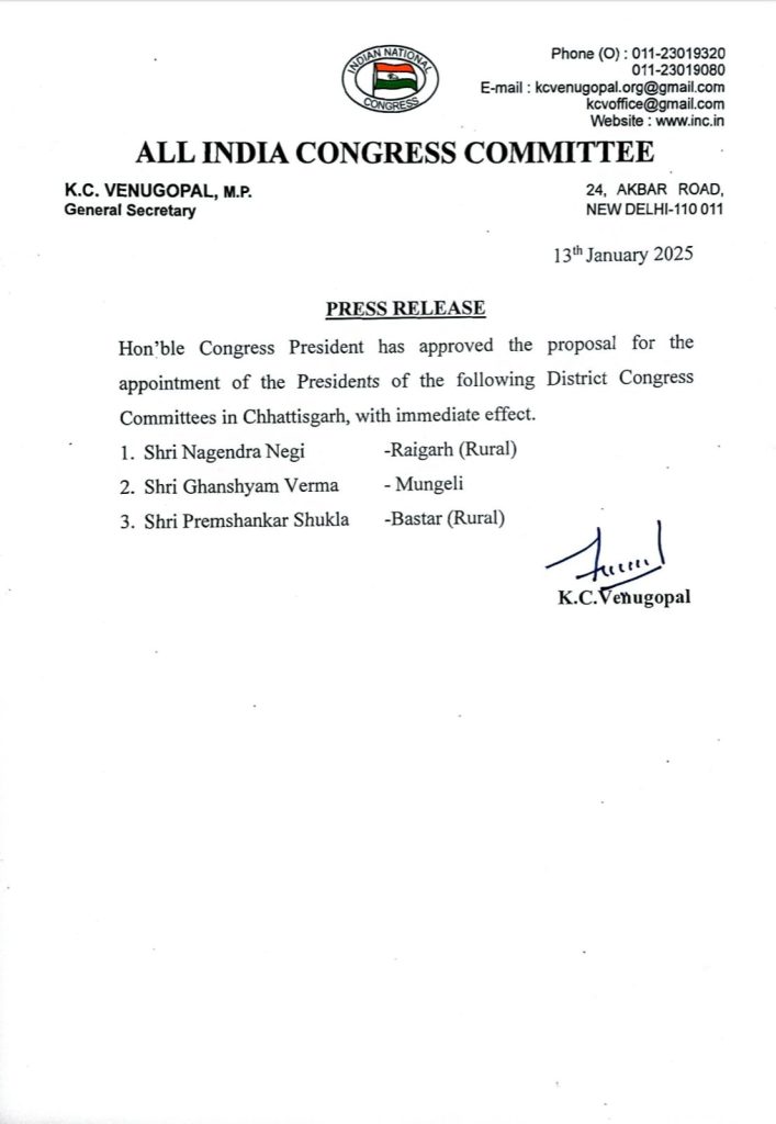 रायपुर। कांग्रेस ने देर रात छत्तीसगढ़ में जिलाध्यक्षों की नियुक्ति की घोषणा कर दी है. कांग्रेस पार्टी की पहली सूची में तीन जिलों के नए जिलाध्यक्षों की नियुक्ति की गई है. यह नियुक्तियां रायगढ़, मुंगेली और बस्तर (ग्रामीण) जिले में की गई है.