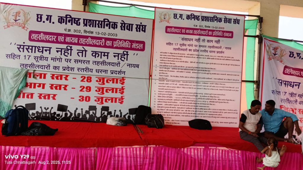 नवा रायपुर के तूता धरना स्थल पर छत्तीसगढ़ के 550 से अधिक तहसीलदार और नायब तहसीलदार ने प्रदर्शन करते है. लेकिन शनिवार को यहां का स्टेज खाली था. जिसके बाद लल्लूराम डॉट कॉम ने तहसीलदारों से संपर्क किया तो पता चला कि आज तो हड़ताल की भी छुट्टी है.