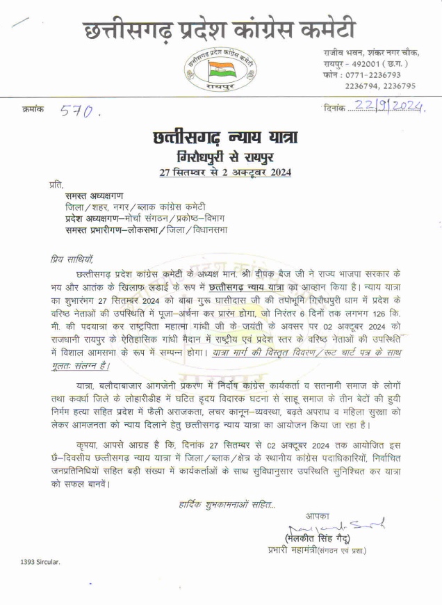 रायपुर। छत्तीसगढ़ प्रदेश कांग्रेस कमेटी के अध्यक्ष दीपक बैज ने 27 सितंबर से 2 अक्टूबर 2024 तक आयोजित होने वाली “छत्तीसगढ़ न्याय यात्रा” के सफल संचालन के लिए विभिन्न समितियों का गठन किया है। इसके साथ ही इस यात्रा के मार्ग का विस्तृत विवरण भी साझा किया गया है, जिससे सभी को यात्रा की योजना और उसके उद्देश्यों की स्पष्ट जानकारी मिल सके।