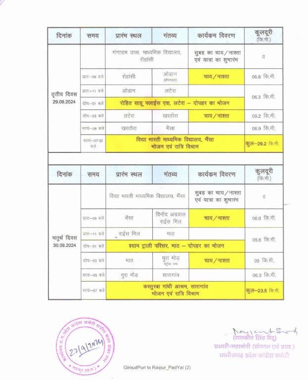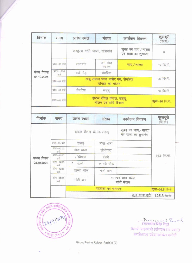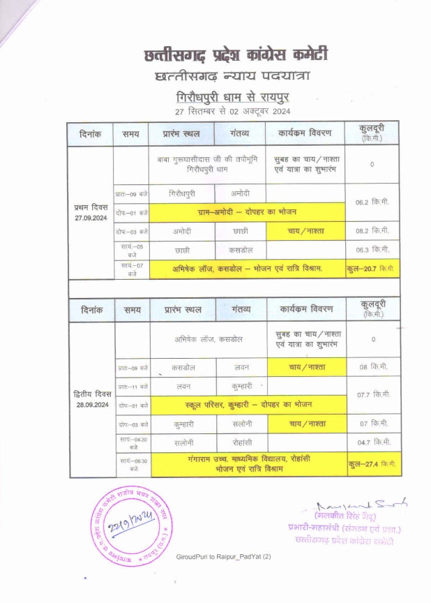 यात्रा की शुरुआत बाबा गुरु घासीदास जी की तपोभूमि गिरौधपुरी धाम से होगी, जहां प्रदेश के वरिष्ठ नेताओं की उपस्थिति में पूजा-अर्चना की जाएगी। यह यात्रा लगभग 126 किलोमीटर की पदयात्रा के रूप में आयोजित की जाएगी और इसका समापन 2 अक्टूबर 2024 को रायपुर के ऐतिहासिक गांधी मैदान में होगा।
