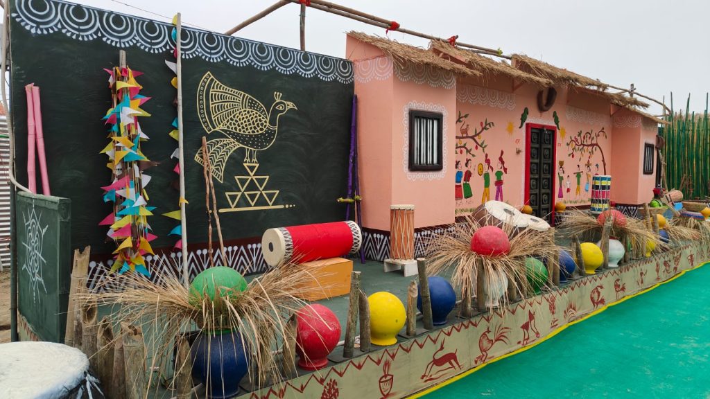 पैवेलियन के भीतर प्रवेश करते ही बांयी तरफ छत्तीसगढ़ के जीवंत ग्रामीण परिवेश को दिखाया गया है. यहां पर परंपरागत ग्रामीण जीवन के साथ ही आदिवासी कला, संस्कृति, आभूषण, वस्त्र समेत एक संपूर्ण गांव का चित्रण स्थापित किया गया है.