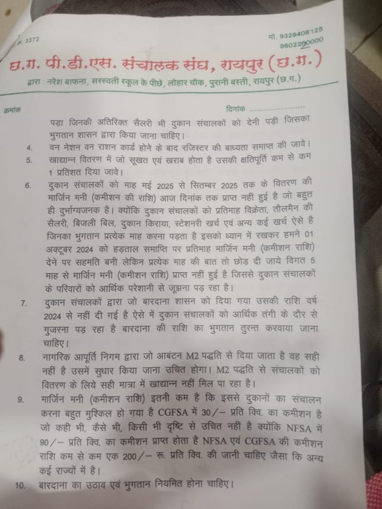 छत्तीसगढ़ PDS संचालक संघ द्वारा लंबित मांगो को लेकर CM साय को लिखा पत्र