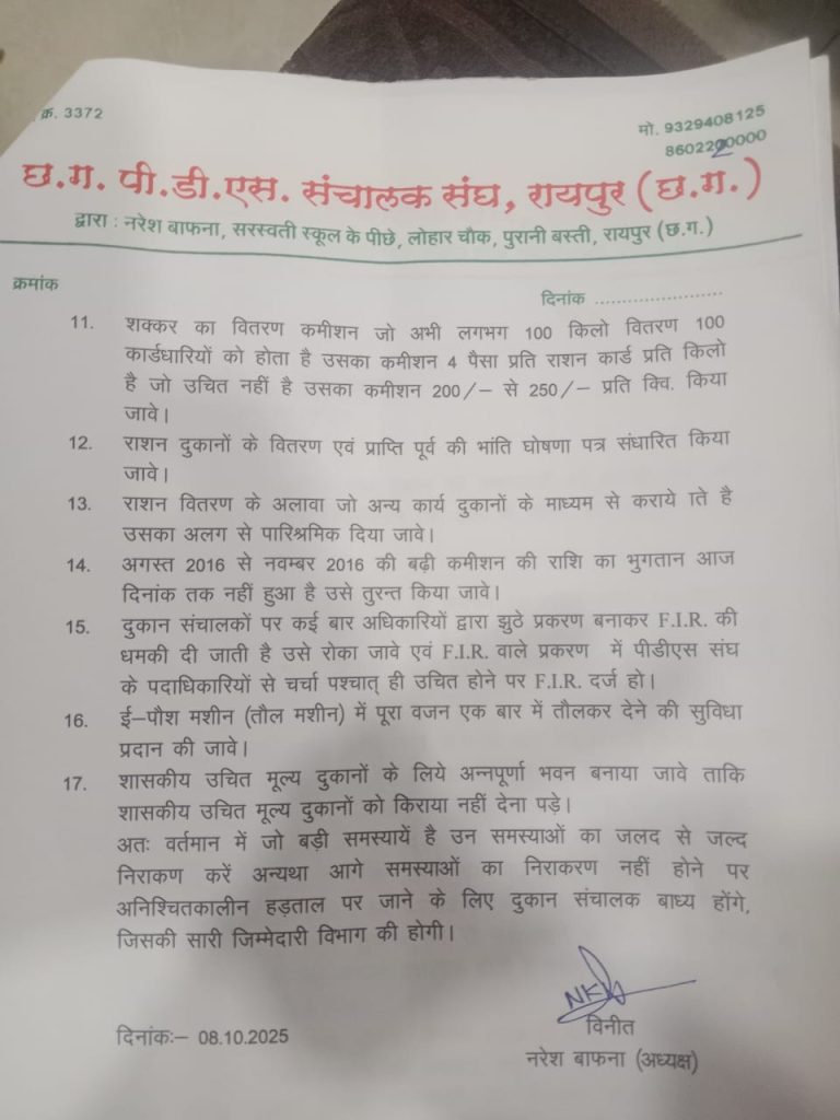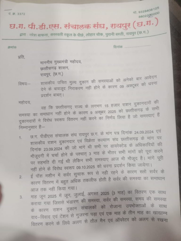गौरतलब है कि इससे पहले बीते 8 सितंबर को PDS संचालक संघ ने मुख्यमंत्री को आवेदन भेजकर धरना प्रदर्शन की जानकारी दी। इसमें उन्होंने स्पष्ट किया कि पिछले साल (2024) की मांगों पर विभाग ने सहमति दी थी, लेकिन आज तक समस्याओं का समाधान नहीं हुआ।