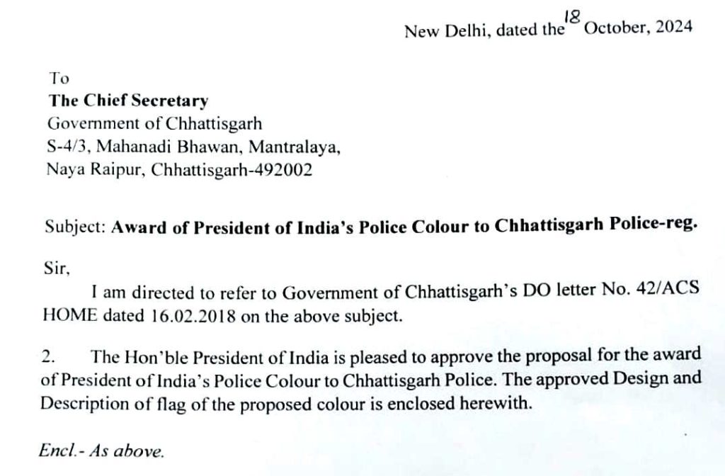 छत्तीसगढ़ सरकार ने 16 फरवरी 2018 को गृह विभाग के माध्यम से यह प्रस्ताव भेजा था, जिसे अब स्वीकृति मिली है. इस सम्मान के साथ, पुलिस बल के जवान इस ध्वज की प्रतिकृति को अपनी वर्दी पर प्रतीक चिन्ह के रूप में धारण करेंगे, जो उनके शौर्य और सेवा का प्रतीक होगा.