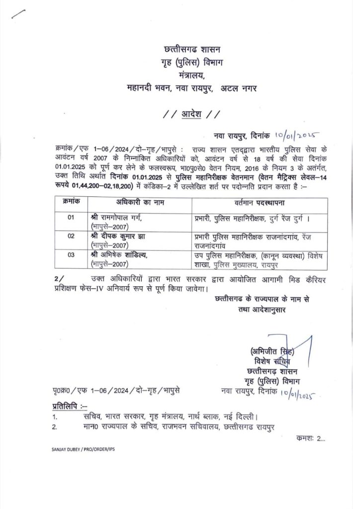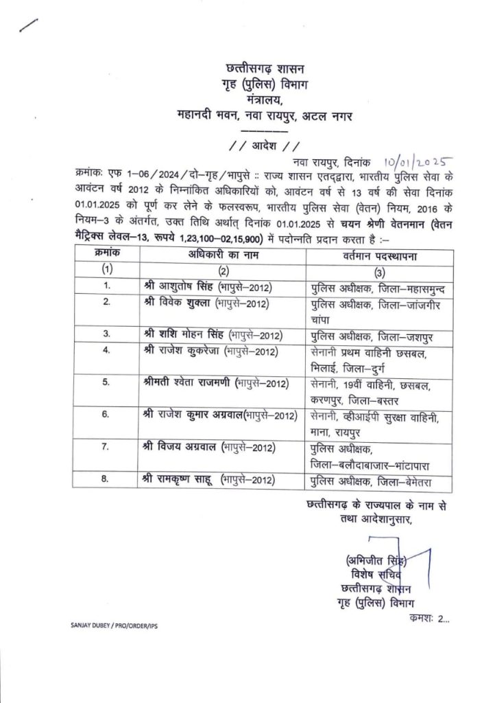 2012 बैच के आईपीएस आशुतोष सिंह, विवेक शुक्ला, शशि मोहन सिंह, राजेश कुकरेजा, श्वेता राजमणि, राजेश कुमार अग्रवाल, विजय अग्रवाल और रामकृष्ण साहू को सेलेक्शन ग्रेड मिला है.