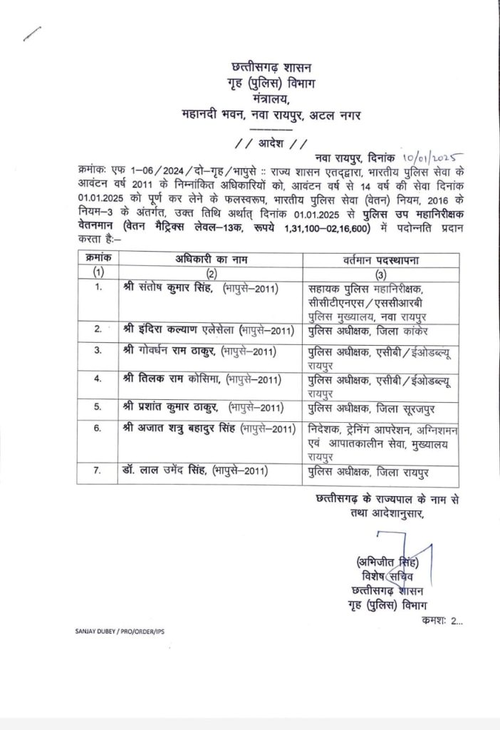 वहीं 2011 बैच के 8 IPS अधिकारी संतोष कुमार सिंह, इंदिरा कल्याण ऐलेसेला, गोवर्धन राम ठाकुर, तिलक राम कोसीमा, प्रशांत कुमार ठाकुर, आजत शत्रु बहादुर और लाल उमेद सिंह को एसएसपी से डीआईजी प्रमोट किया गया है.