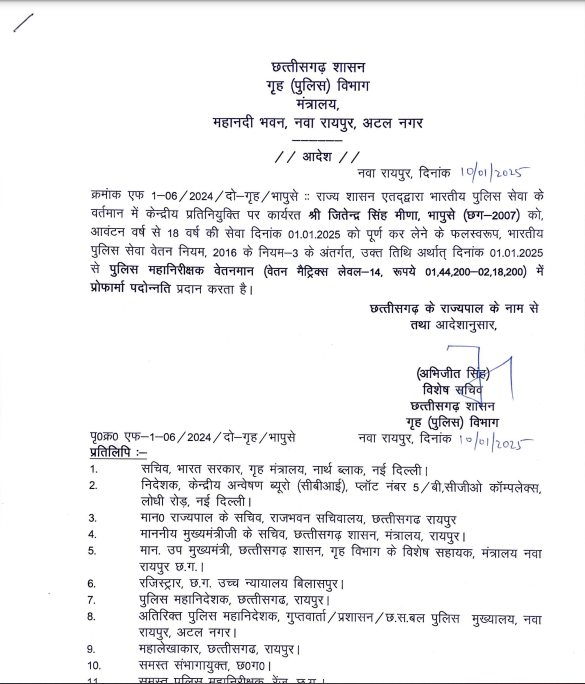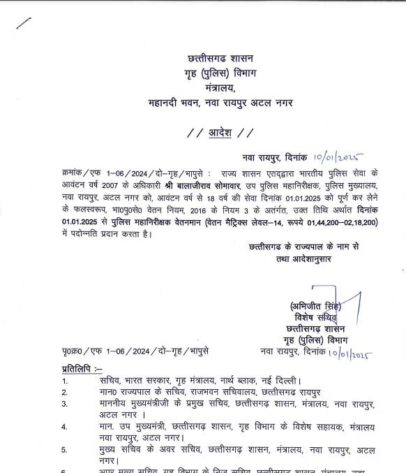 CG IPS Promotion: रायपुर। राज्य सरकार ने भारतीय पुलिस सेवा के अधिकारियों को प्रमोशन दिया है. 2007 बैच के IPS अधिकारी रामगोपाल गर्ग, दीपक कुमार झा, अभिषेक शांडिल्य और बालाजी राव सोमावार को DIG से IG प्रमोट किया गया है. इसके साथ ही केंद्रीय प्रतनियुक्ति पर रहने की वजह से जितेंद्र सिंह मीणा को प्रोफार्मा पदोन्नति दी गई है.