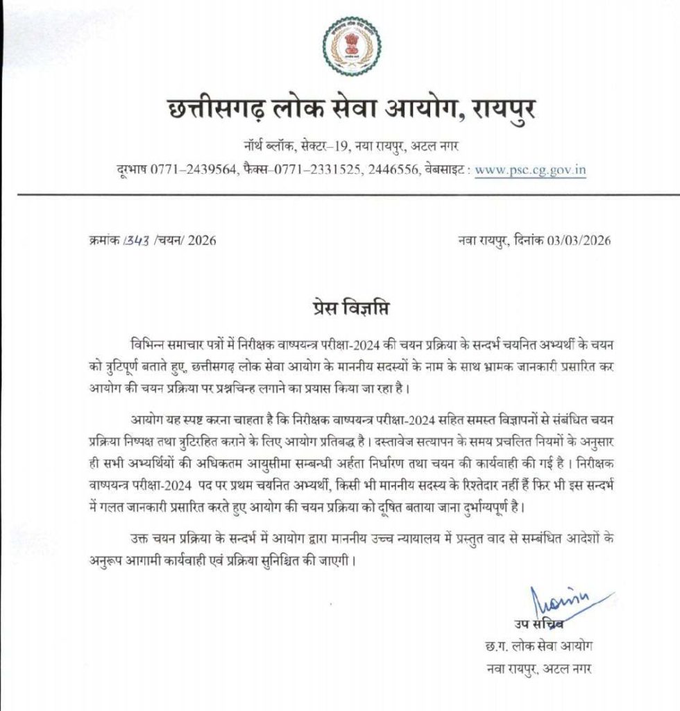 रायपुर। उद्योग विभाग में बायलर इंस्पेक्टर (निरीक्षक वाष्पयंत्र परीक्षा-2024) के पद पर नियुक्ति को लेकर उठे विवाद पर छत्तीसगढ़ लोक सेवा आयोग (PSC) ने आधिकारिक स्पष्टीकरण जारी कर आरोपों को भ्रामक बताया है। आयोग ने कहा है कि चयन प्रक्रिया पूरी तरह नियमों के अनुरूप और पारदर्शी ढंग से संपन्न की गई है।