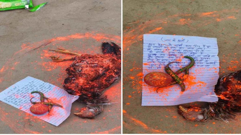 सीपत थाना प्रभारी गोपाल सतपथी ने बताया कि ग्राम पंधी में रहने वाले वृंदा केंवट किसान हैं. किसी ने उनके आंगन में बंदन में रंगे नींबू, मिर्च और मरी हुई काली मुर्गी रख दी. इसके नीचे ही एक धमकी भरा पत्र छोड़ा गया है, जिसमें किसी लड़की के आने के कारण उनके घर में ग्रह बाधा की चेतावनी दी गई है. साथ ही लड़की को घर में रखने पर उसकी मौत हो जाने की बात पत्र में कही गई है. किसान ने इसकी शिकायत थाने में की है. मामले में पुलिस की टीम ने गांव के लोगों से पूछताछ की है.