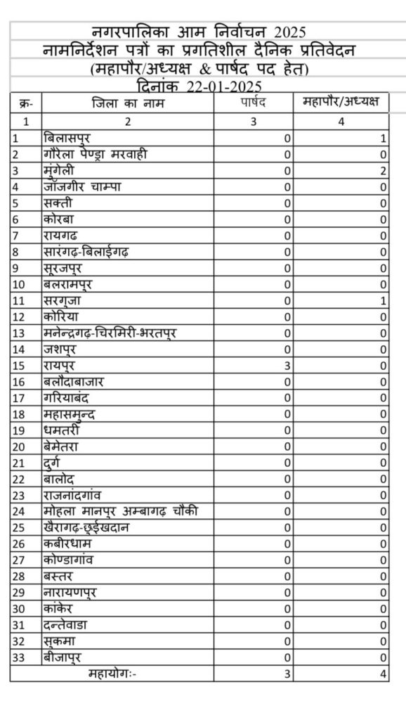 सत्या राजपूत, रायपुर। छत्तीसगढ़ में नगरीय निकाय चुनाव एक चरण में होंगे और इसके लिए नामांकन प्रक्रिया बुधवार से शुरू हो गई है. पहले दिन कुल 7 नामांकन दाखिल किए गए. इनमें से 3 नामांकन पार्षद के लिए, 4 नामांकन महापौर के लिए दाखिल किए गए. रायपुर जिले से ही महज तीन फार्म जमा हुए हैं, जबकि बाकी 32 जिलों में नामांकन का खाता भी नहीं खुला.