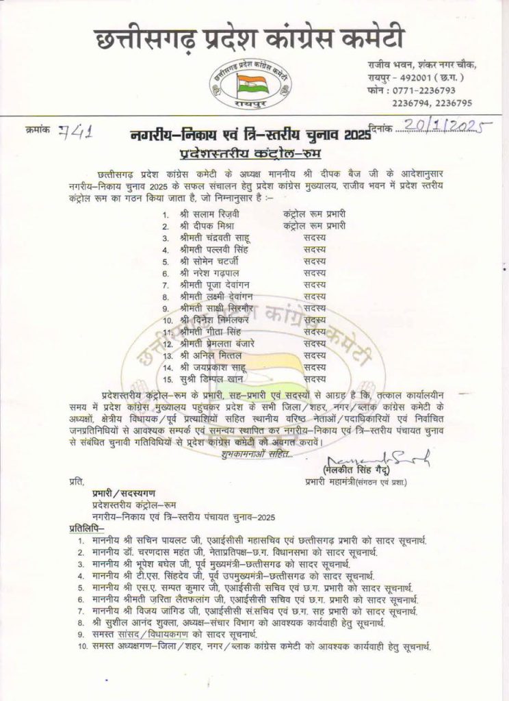 लक्षिका साहू, रायपुर। छत्तीसगढ़ में नगरीय निकाय और त्रिस्तरीय पंचायत चुनाव की तैयारियों को ध्यान में रखते हुए कांग्रेस ने प्रदेश स्तरीय कंट्रोल रूम का गठन किया है। यह कंट्रोल रूम 15 सदस्यों की टीम के साथ काम करेगा। इस कंट्रोल रूम की जिम्मेदारी सलीम रिज़वी और दीपक मिश्रा को सौंपी गई है। इनके नेतृत्व में चुनावी गतिविधियों पर कड़ी नजर रखी जाएगी।