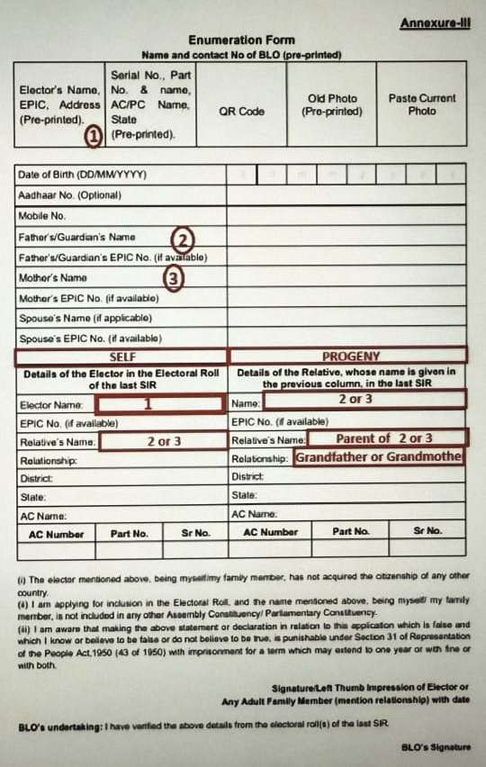भारत निर्वाचन आयोग द्वारा SIR के लिए जारी गणना प्रपत्र (एन्यूमरेशन फॉर्म) का प्रारूप निम्नानुसार है: