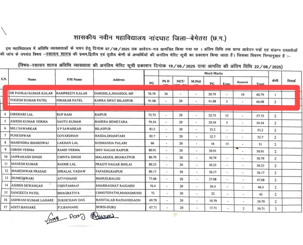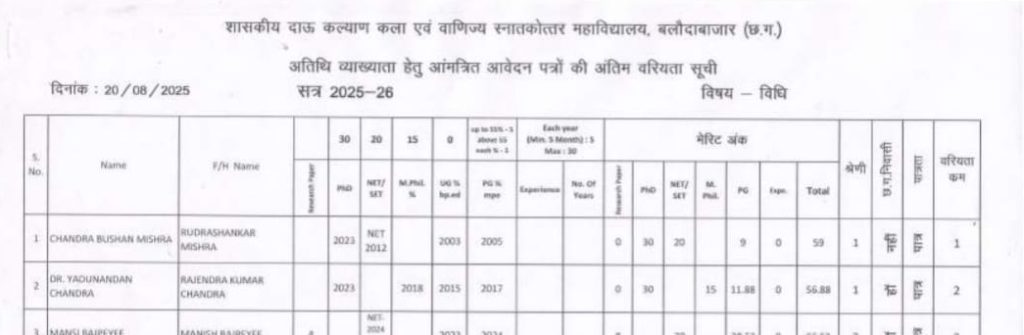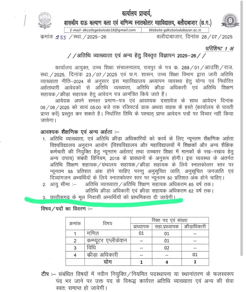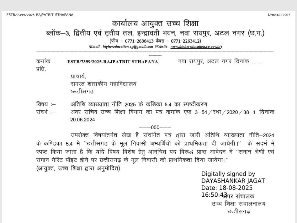 बलौदाबाजार। छत्तीसगढ़ शासन द्वारा प्रदेश के महाविद्यालयों में अतिथि प्राध्यापकों की नियुक्ति को लेकर जारी आदेश ने प्रदेश के युवा अभ्यर्थियों में आक्रोश फैला दिया है. पहले जारी विज्ञापन में छत्तीसगढ़ निवासियों को प्राथमिकता देने की बात कही गई थी, जिसके बाद स्थानीय युवाओं ने उत्साहपूर्वक आवेदन किया. लेकिन हाल ही में जारी नए आदेश में स्पष्ट किया गया है कि समान अंक होने पर ही छत्तीसगढ़ के अभ्यर्थियों को प्राथमिकता दी जाएगी.