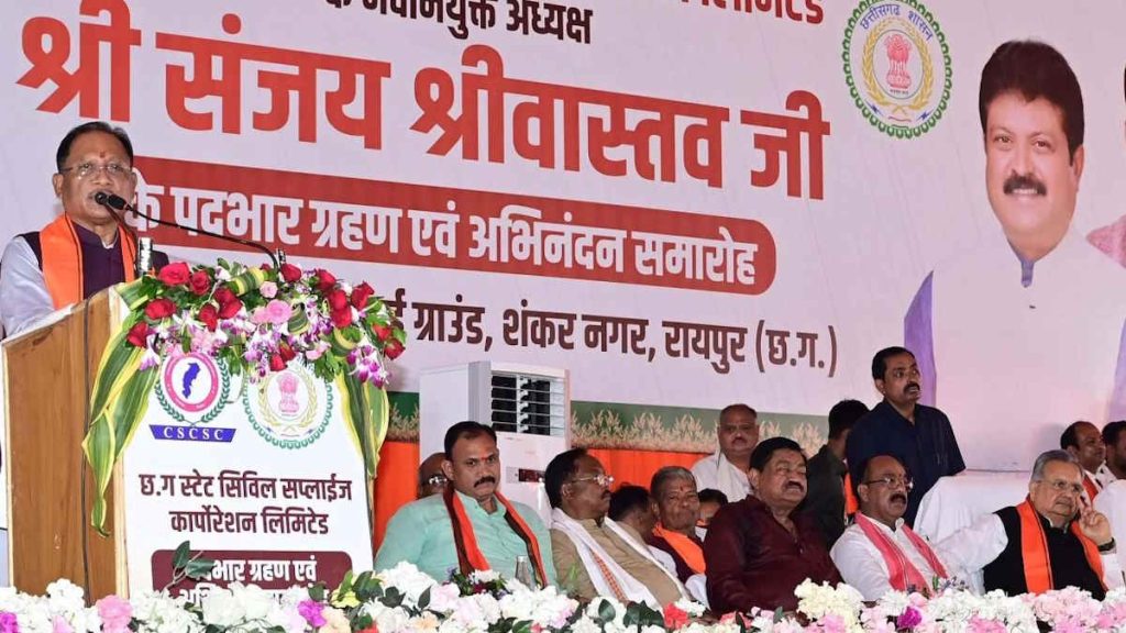 राजधानी रायपुर के शंकर नगर स्थित बीटीआई ग्राउंड में आयोजित समारोह में शामिल मुख्यमंत्री साय ने छत्तीसगढ़ स्टेट सिविल सप्लाईज कॉर्पाेरेशन लिमिटेड के नवनियुक्त अध्यक्ष संजय श्रीवास्तव को पदभार ग्रहण करने पर बधाई एवं शुभकामनाएं दी. उन्होंने संजय श्रीवास्तव की प्रशंसा करते हुए कहा कि बेहद अनुभवी हैं. रायपुर नगर निगम में सभापति और रायपुर विकास निगम के अध्यक्ष का दायित्व भी उन्होंने निभाया है.