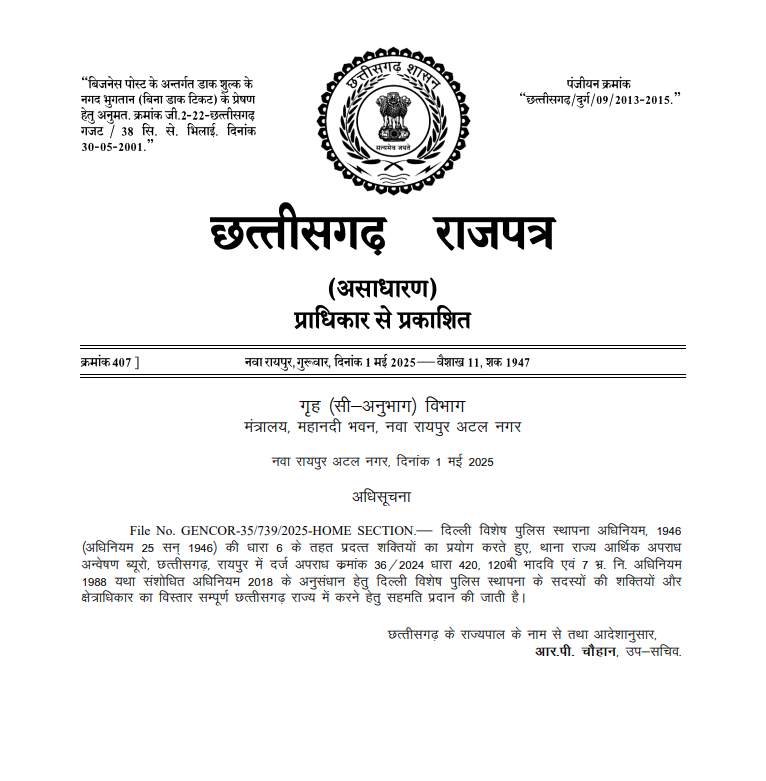 शिवम मिश्रा,रायपुर। झारखंड में शराब नीति में बदलाव कर करोड़ों रुपये के घोटाले को अंजाम देने के मामले की जांच अब CBI करेगी। छत्तीसगढ़ सरकार ने इसके लिए अधिसूचना जारी करते हुए दिल्ली विशेष पुलिस स्थापना अधिनियम, 1946 की धारा 6 के तहत CBI को छत्तीसगढ़ में जांच के लिए सहमति दी है। यह मामला रायपुर स्थित आर्थिक अपराध अन्वेषण ब्यूरो (EOW) द्वारा दर्ज अपराध से जुड़ा है।
