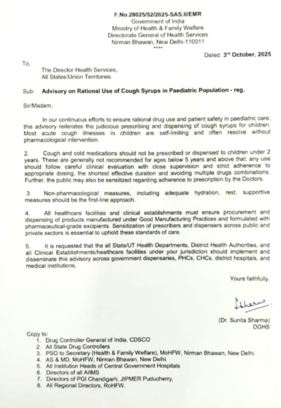 शब्बीर अहमद, भोपाल। मध्य प्रदेश के छिंदवाड़ा जिले में संदिग्ध कफ सिरप के सेवन से 9 बच्चों की मौत के मामले ने पूरे देश को हिलाकर रख दिया है। इसमें बच्चों की किडनी फेलियर से मौतें हो रही हैं। इस मामले को गंभीरता से लेते हुए केंद्रीय स्वास्थ्य एवं परिवार कल्याण मंत्रालय ने आज एक महत्वपूर्ण एडवाइजरी जारी की है। मंत्रालय ने 5 साल से कम उम्र के बच्चों को कफ सिरप या अन्य ऐसी दवाओं से दूर रहने की सलाह दी है, जबकि 2 साल से कम उम्र के बच्चों के लिए तो इसे पूरी तरह प्रतिबंधित कर दिया गया है। विशेषज्ञों का कहना है कि बिना डॉक्टर की सलाह के ऐसी दवाओं का इस्तेमाल घातक साबित हो सकता है।