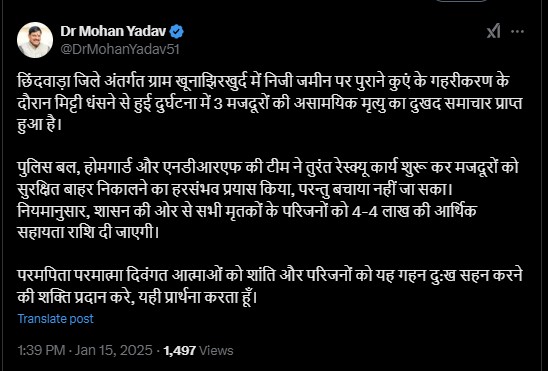 सीएम डॉ. मोहन यादव ने अपने आधिकारिक सोशल मीडिया प्लेटफॉर्म एक्स पर पोस्ट कर लिखा, “छिंदवाड़ा जिले अंतर्गत ग्राम खूनाझिरखुर्द में निजी जमीन पर पुराने कुएं के गहरीकरण के दौरान मिट्टी धंसने से हुई दुर्घटना में 3 मजदूरों की असामयिक मृत्यु का दुखद समाचार प्राप्त हुआ है। पुलिस बल, होमगार्ड और एनडीआरएफ की टीम ने तुरंत रेस्क्यू कार्य शुरू कर मजदूरों को सुरक्षित बाहर निकालने का हरसंभव प्रयास किया, परन्तु बचाया नहीं जा सका। नियमानुसार, शासन की ओर से सभी मृतकों के परिजनों को 4-4 लाख की आर्थिक सहायता राशि दी जाएगी। परमपिता परमात्मा दिवंगत आत्माओं को शांति और परिजनों को यह गहन दु:ख सहन करने की शक्ति प्रदान करे, यही प्रार्थना करता हूं।”