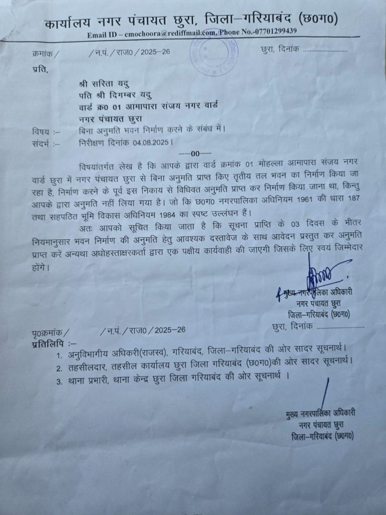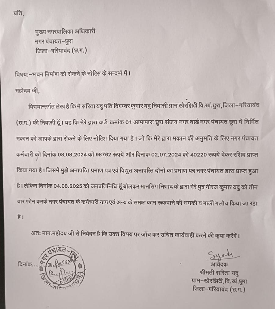 पुरुषोत्तम पात्र, गरियाबंद। छुरा नगर पंचायत में BJP की महिला अध्यक्ष लुकेश्वरी निषाद के देवर मानसिंह निषाद पर गंभीर आरोप लगे हैं। वार्ड क्रमांक 1 में भवन निर्माण करा रहे नीरज यदु का कहना है कि 4 अगस्त को मानसिंह ने फोन कर न सिर्फ अभद्र भाषा का प्रयोग किया, बल्कि काम रुकवाने की धमकी भी दी। कुछ ही घंटों बाद नगर पंचायत की ओर से निर्माण रोकने का नोटिस भी थमा दिया गया।