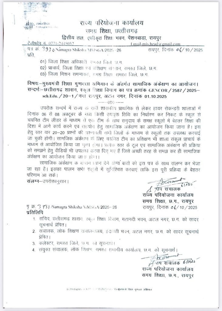 सत्या राजपूत, रायपुर। छत्तीसगढ़ शासन ने मुख्यमंत्री शिक्षा गुणवत्ता अभियान के अंतर्गत प्रदेश भर के शासकीय प्राथमिक, माध्यमिक, हाई स्कूल और हायर सेकेंडरी स्कूलों में सामाजिक अंकेक्षण कराने के निर्देश जारी किए हैं। यह अंकेक्षण 6 से 8 अक्टूबर 2025 के बीच किसी भी उपयुक्त तिथि को किया जाएगा।