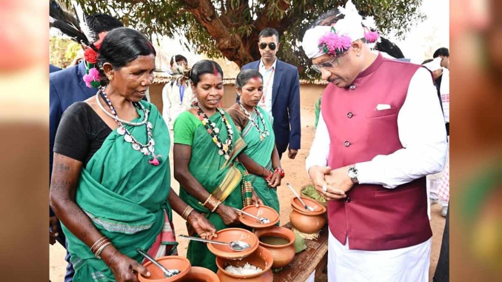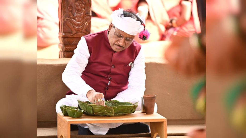 मुख्यमंत्री साय ने घोटुल परिसर के लेय्योर एवं लेयोस्क कुरमा: युवाओं और युवतियों के लिए निर्मित कक्षों के साथ ही बिडार कुरमा: पारंपरिक वेशभूषा, प्राचीन वाद्ययंत्र एवं सांस्कृतिक सामग्रियों का संग्रह का निरीक्षण किया. इस दौरान ग्रामीणों की आग्रह पर मुख्यमंत्री साय ने सगा कुरमा में बस्तर के पारंपरिक व्यंजनों का स्वाद लेकर क्षेत्र की खान-पान संस्कृति का सम्मान किया. इस दौरान मुख्यमंत्री के भोजन में विशेष रूप से भोजन गाटो-भात, कोदो-भात, उड़िद दार, हिरुवा दार, जीरा भाजी, कनकी पेज, भाजी घिरोल फुल, चाटी भाजी, कांदा भाजी, मुनगा भाजी, इमली आमट, मड़िया पेज, टमाटर चटनी, चिला रोटी, रागी कुरमा, रागी केक, रागी लट्टू, रागी जलेबी परोसा गया.