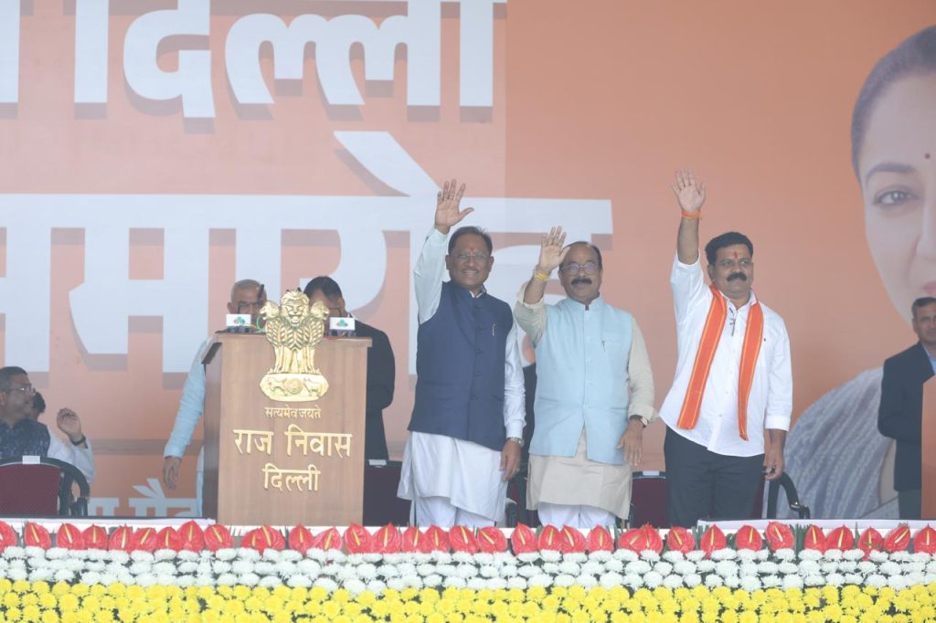 रायपुर. दिल्ली में 27 साल बाद बीजेपी की सरकार बन गई है. रेखा गुप्ता ने दिल्ली की नौवीं और चौथी महिला सीएम के रूप में शपथ ले ली है. इस अवसर पर छत्तीसगढ़ के मुख्यमंत्री विष्णुदेव साय भी शपथ ग्रहण समारोह में शामिल हुए. उन्होंने दिल्ली की नव नियुक्त मुख्यमंत्री रेखा गुप्ता को शुभकामनाएं दीं. इस दौरान उनके साथ प्रदेश के दोनों डिप्टी सीएम अरुण साव और डिप्टी सीएम विजय शर्मा भी मौजूद रहे.