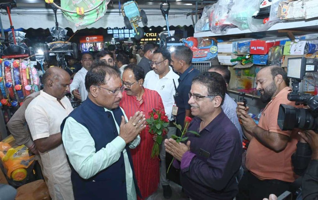 जयस्तंभ चौक पर मुख्यमंत्री का स्वागत चैम्बर ऑफ कॉमर्स और पार्टी पदाधिकारियों ने किया। इसके बाद वे शारदा चौक पहुंचे और वहां देवी प्रतिमा के दर्शन कर भक्तों से आत्मीय संवाद किया। इस दौरान नवरात्रि की शुभकामनाएं दी। इसके पश्चात मुख्यमंत्री पूनम होटल से लेकर मंजू ममता होटल तक पैदल भ्रमण करते हुए आगे बढ़े। सड़क किनारे खड़े छोटे दुकानदारों से लेकर बड़े प्रतिष्ठानों तक, सभी ने मुख्यमंत्री से संवाद करने की उत्सुकता दिखाई। मुख्यमंत्री ने भी आत्मीयता के साथ सभी की बातें सुनीं और जीएसटी 2.0 के लाभों पर उनकी प्रतिक्रियाएं जानीं।