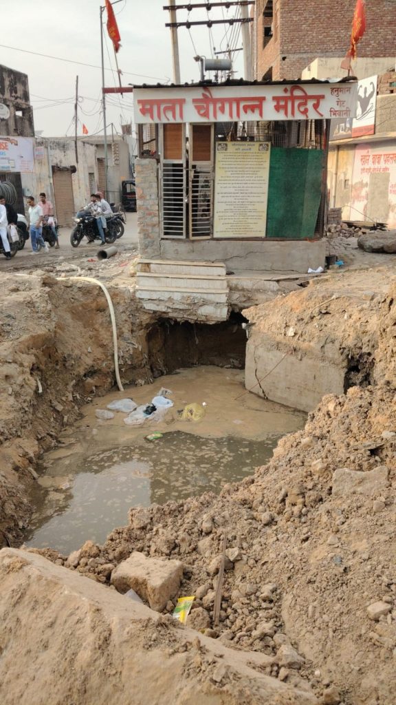 अजय सैनी, भिवानी। शहर के हनुमान गेट क्षेत्र में लंबे समय से पानी के रिसाव के चलते स्थिति गंभीर हो गई है। लगातार हो रहे इस रिसाव के कारण क्षेत्र स्थित चौगान माता मंदिर की नींव दरकने लगी है इस कारण मंदिर का एक हिस्सा झुकने भी लगा है। इस कारण मंदिर के गिरने का खतरा पैदा हो गया है। समस्या के समाधान को लेकर क्षेत्रवासियों ने सोमवार को मंदिर के निकट धरना दिया और तत्काल पानी के रिसाव को बंद करने की मांग के साथ-साथ मंदिर। वह मजबूती प्रदान करने के लिए जिला प्रशासन से गुहार लगयी। हालात ऐसे बन चुके हैं कि अगर समय रहते उचित कदम नहीं उठाए गए तो कभी भी बड़ा हादसा हो सकता है।