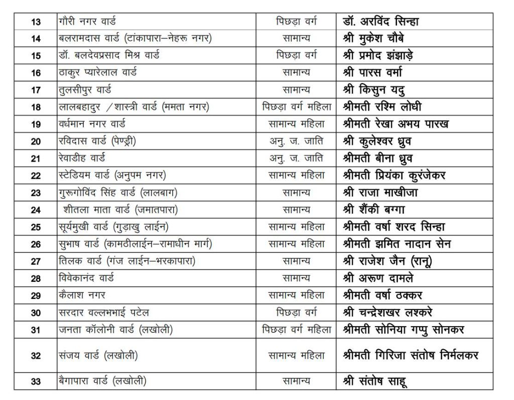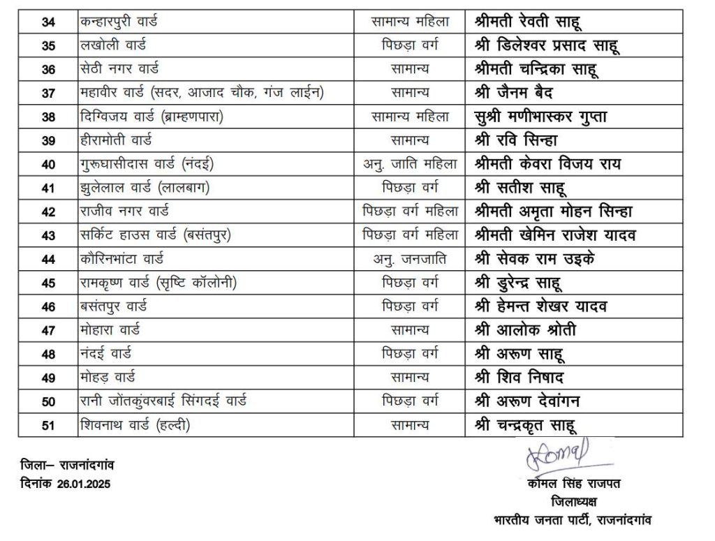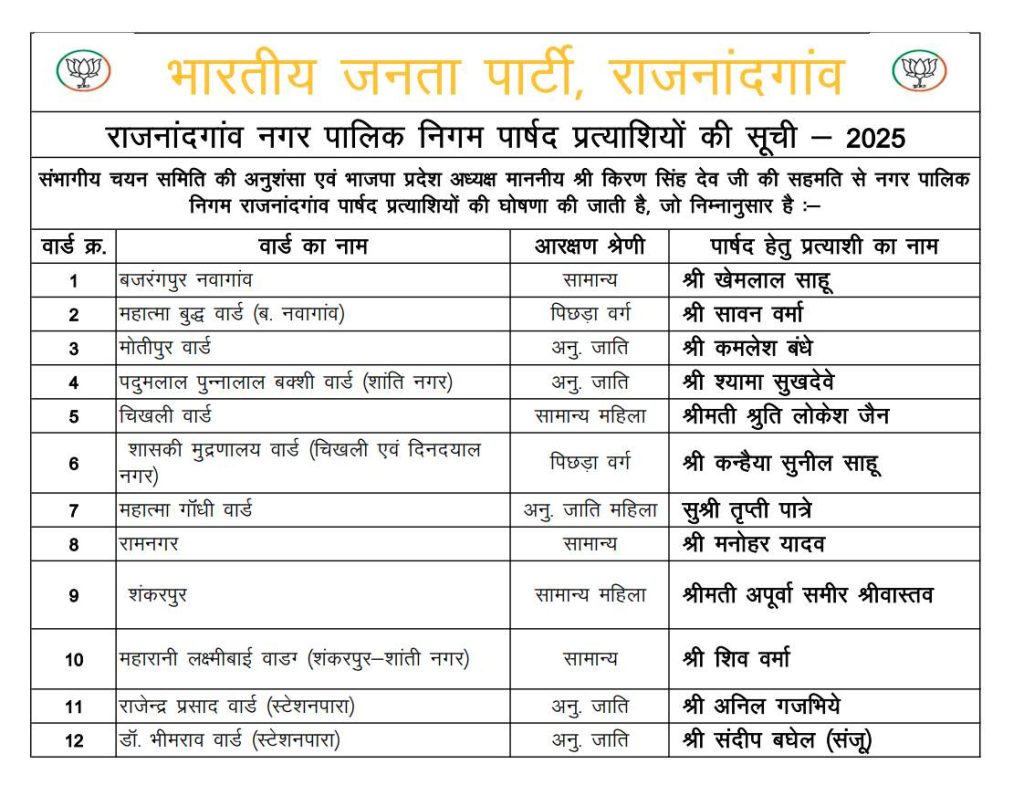ललित ठाकुर, राजनांदगांव। छत्तीसगढ़ में आगामी नगरीय निकाय चुनाव के मद्देनजर बीजेपी (भारतीय जनता पार्टी) ने राजनांदगांव नगर निगम के सभी 51 वार्डों में अपने पार्षद प्रत्याशियों का ऐलान कर दिया है। रविवार की देर शाम पार्टी ने सभी 51 पार्षद प्रत्याशियों के नामों की लिस्ट जारी की है। जानिए पार्टी ने किस वार्ड से किस प्रत्याशी को मौका दिया है।
