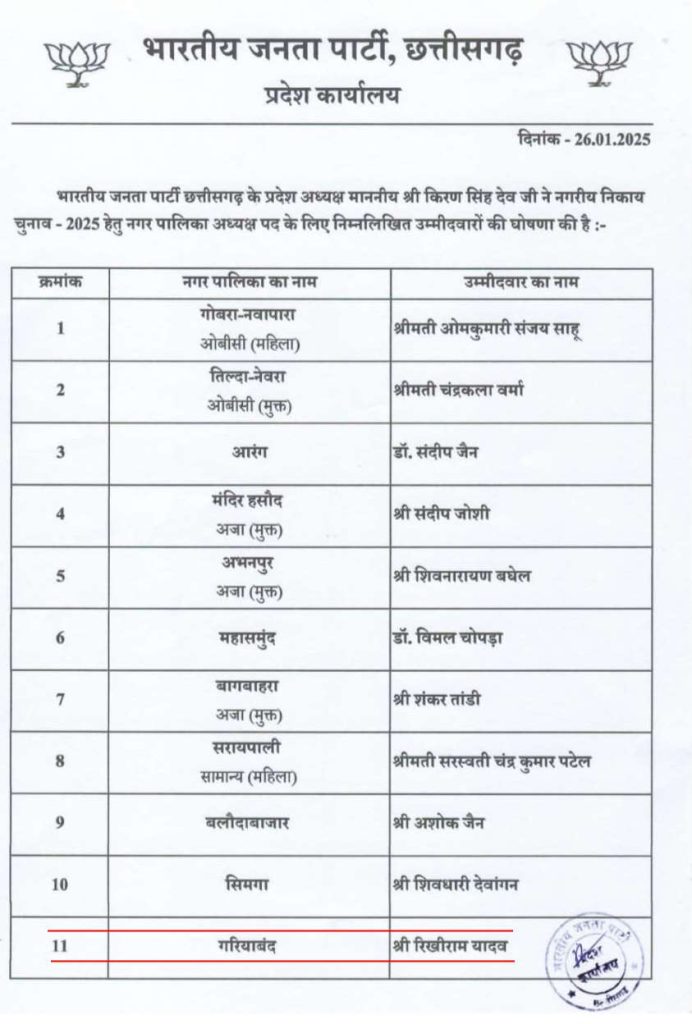 रायपुर। नगरीय निकाय चुनाव को लेकर पार्टियों में किस कदर दबाव है, इसका अंदाजा इस बात से लग जाता है कि भाजपा ने 24 घंटे के भीतर गरियाबंद नगर पालिका के अध्यक्ष पद के लिए अपना घोषित उम्मीदवार बदल दिया. कल तक जिस अधिवक्ता प्रशांत मानिकपुरी को पार्टी ने अपना उम्मीदवार बनाया था, वहीं आज रिखीराम यादव को उम्मीदवार घोषित कर सबको चौंका दिया है. यह भी पढ़ें : निकाय चुनाव 2025 : भाजपा ने 47 नगर पालिका अध्यक्ष के प्रत्याशियों का किया ऐलान, देखें पूरी लिस्ट