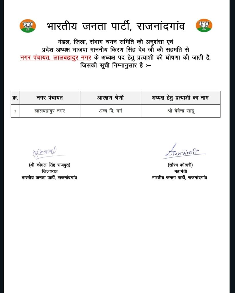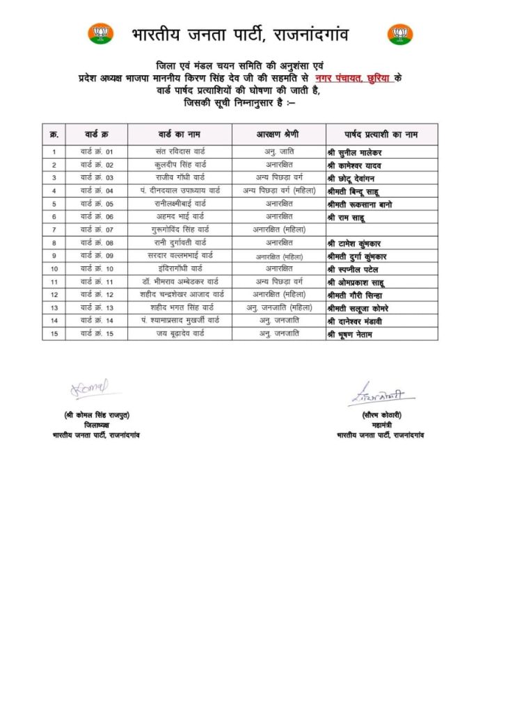 रायपुर। नगरीय निकाय चुनाव के लिए भाजपा ने प्रत्याशियों की पहली सूची जारी कर दी है. बीजेपी की पहली लिस्ट में राजनांदगांव जिले के छुरिया, एलबी नगर और डोंगरगढ़ नगर पालिका के पार्षद प्रत्याशियों का लिस्ट जारी किया है.