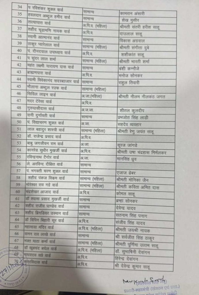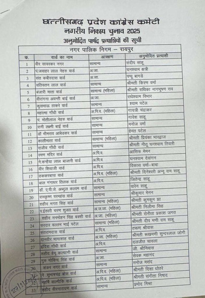 नितिन नामदेव, रायपुर. कांग्रेस ने देर रात नगर निगम रायपुर के पार्षद प्रत्याशियों की सूची जारी की है. इसमें 66 प्रत्याशियों के नाम का ऐलान किया गया है. 4 वार्ड के पार्षद प्रत्याशियों की घोषणा होना अभी बाकी है. कांग्रेस ने इस बार कई सीटिंग पार्षदों के टिकट काटे हैं. पूर्व महापौर एजाज ढेबर पूर्व महापौर प्रमोद दुबे के वार्ड क्रमांक 57 पंडित भगवती चरण शुक्ल वार्ड से चुनाव लड़ेंगे.