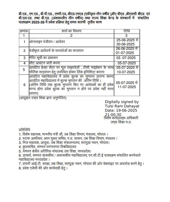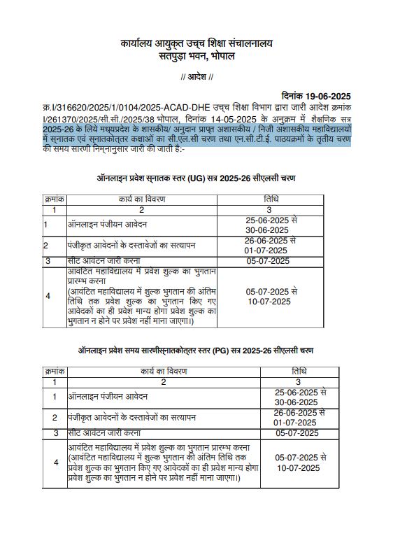 भोपाल। मध्य प्रदेश में स्नातक (UG) और स्नातकोत्तर (PG) कक्षाओं में प्रवेश के लिए सीएलसी चरण और एनसीटीई पाठ्यक्रम के तृतीय चरण की समय सारणी जारी कर दी गई है। आदेश के मुताबिक, 25 से 30 जून तक स्नातक और स्नातकोत्तर में सीएलसी चरण के लिए ऑनलाइन पंजीयन कर सकते है। 26 जून से 1 जुलाई तक दस्तावेजों का सत्यापन किया जाएगा। वहीं 5 जुलाई को सीट आवंटन होगी।