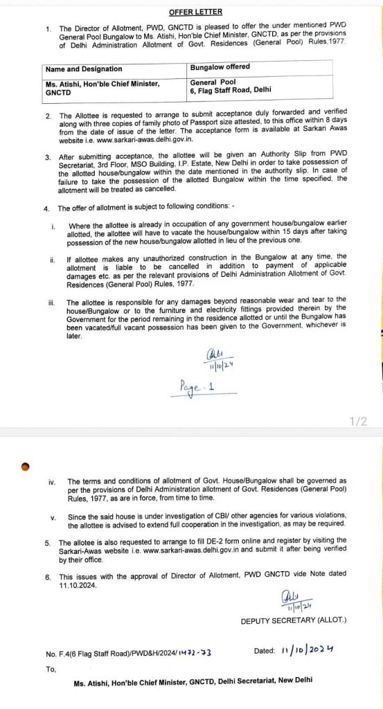 CM Atishi को मिला आवास: पीडब्ल्यूडी ने आतिशी को 6 फ्लैग स्टाफ रोड स्थित बंगला आवंटित किया है, जो पूर्व मुख्यमंत्री अरविंद केजरीवाल का निवास स्थान रहा है.