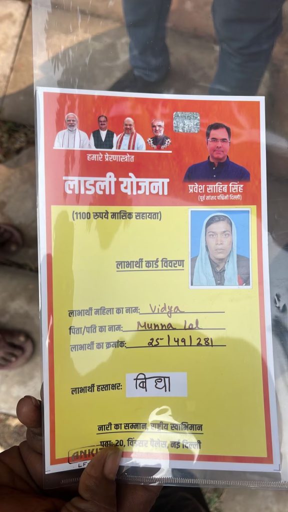 Delhi Assembly Election 2025: पश्चिमी दिल्ली से बीजेपी के पूर्व सांसद प्रवेश वर्मा(Pravesh Verma) को लेकर एक सनसनीखेज मामला सामने आया है. घर के पिछले दरवाजे पर महिलाओं की भीड़ लगी हुई है. इन महिलाओं के हाथों में एक कार्ड है जिस पर लिखा है कि मासिक लाड़ली योजना 1100 रुपये है, साथ ही ये भी कहा जा रहा है कि चुनाव जीतने पर 2500 रुपये दिए जाएंगे, जिसके लिए कमल के निशान का बटन दबाना होगा.