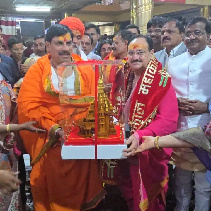 श्री महाकालेश्वर मंदिर प्रबंधन समिति की ओर से मुख्यमंत्री डॉ. मोहन यादव ने केंद्रीय मंत्री नड्डा को स्मृति चिन्ह, दुपट्टा और प्रसाद भेंटकर सम्मान किया। साथ ही महाकालेश्वर मंदिर प्रबंधन समिति की ओर से नीरज कुमार सिंह ने सीएम डॉ. यादव और सांसद VD शर्मा का सम्मान किया।