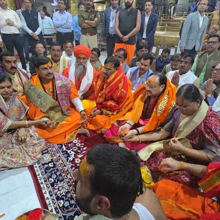 अजय नीमा, उज्जैन। मध्यप्रदेश के मुख्यमंत्री डॉ. मोहन यादव और केंद्रीय स्वास्थ्य एवं परिवार कल्याण मंत्री जगत प्रकाश नड्डा सपत्नीक महाकालेश्वर मंदिर पहुंचे। उज्जैन प्रवास के दौरान उन्होंने बाबा महाकाल के दर्शन कर पूजन-अभिषेक किया। पं. राजेश पुजारी, राम पुजारी और आकाश पुजारी ने पूजा सम्पन्न कराई। इस दौरान प्रशान्त पुजारी, ओम पुजारी और रमन त्रिवेदी भी उपस्थित थे।