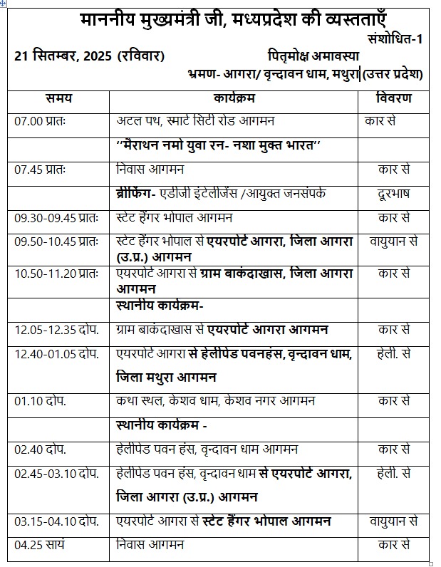 संशोधित कार्यक्रम के मुताबिक, मुख्यमंत्री अब सीधे यूपी के आगरा से राजधानी भोपाल आएंगे। वे आगरा से दोपहर 3.15 बजे उड़ान भरेंगे और करीब 4.10 बजे भोपाल वापस लौटेंगे। शाम 4.25 बजे निवास आगमन होगा।