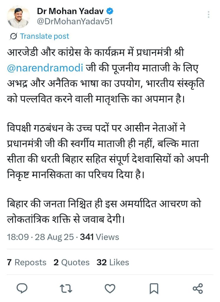 मुख्यमंत्री डॉ मोहन यादव ने अपने सोशल मीडिया अकाउंट एक्स पर पोस्ट कर लिखा- आरजेडी और कांग्रेस के कार्यक्रम में प्रधानमंत्री मोदी की पूजनीय माताजी के लिए अभद्र और अनैतिक भाषा का उपयोग, भारतीय संस्कृति को पल्लवित करने वाली मातृशक्ति का अपमान है। विपक्षी गठबंधन के उच्च पदों पर आसीन नेताओं ने प्रधानमंत्री की स्वर्गीय माताजी ही नहीं, बल्कि माता सीता की धरती बिहार सहित संपूर्ण देशवासियों को अपनी निकृष्ट मानसिकता का परिचय दिया है। बिहार की जनता निश्चित ही इस अमर्यादित आचरण को लोकतांत्रिक शक्ति से जवाब देगी।