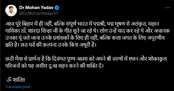 मुख्यमंत्री डॉ मोहन यादव ने अपने सोशल मीडिया एक्स (X) अकाउंट पर पोस्ट कर लिखा- आज पूरे बिहार में ही नहीं, बल्कि संपूर्ण भारत में पद्मश्री, पद्म भूषण से अलंकृत, महान गायिका डॉ. शारदा सिन्हा जी के गीत सुने जा रहे थे। लोग उन्हें याद कर रहे थे और अचानक उनका यूं चले जाना उनके प्रशंसकों के लिए ही नहीं, बल्कि कला जगत के लिए अपूरणीय क्षति है। छठ पर्व की कल्पना उनके बिना अधूरी है। छठी मैया से प्रार्थना है कि दिवंगत पुण्य आत्मा को अपने श्री चरणों में स्थान और शोकाकुल परिजनों को यह असीम दु:ख सहन करने की शक्ति दें। ॐ शांति!!