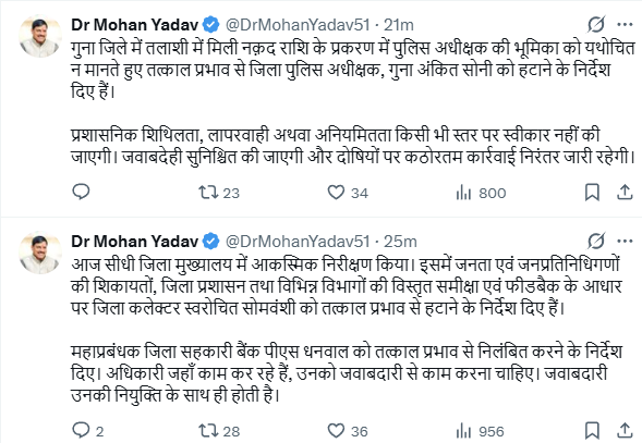इसके साथ ही मुख्यमंत्री डॉ. मोहन यादव ने गुना जिले में तलाशी के दौरान मिली नकद राशि के हेरफेर के मामले में पुलिस अधीक्षक की भूमिका को संतोषजनक नहीं मानते हुए गुना एसपी अंकित सोनी को भी तत्काल प्रभाव से हटाने के निर्देश दिए।