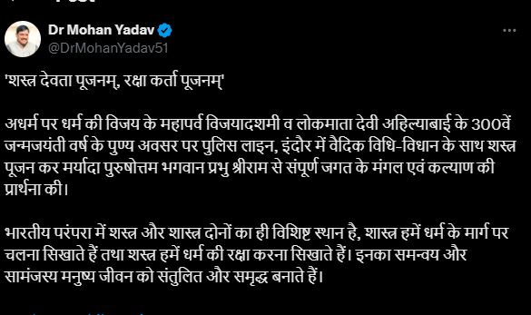 सीएम डॉ. मोहन यादव ने सोशल मीडिया प्लेटफॉर्म एक्स पर लिखा, अधर्म पर धर्म की विजय के महापर्व विजयादशमी व लोकमाता देवी अहिल्याबाई के 300वें जन्म जयंती वर्ष के पुण्य अवसर पर पुलिस लाइन, इंदौर में वैदिक विधि-विधान के साथ शस्त्र पूजन कर मर्यादा पुरुषोत्तम भगवान प्रभु श्रीराम से संपूर्ण जगत के मंगल एवं कल्याण की प्रार्थना की।